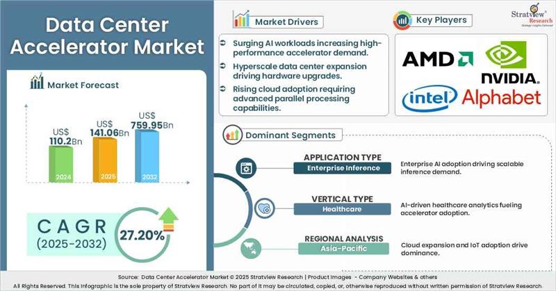- During the next 8 years (forecast period of 2025-2032), the data center accelerator market is expected to grow at a CAGR of 27.20%. The annual demand will reach of USD 759.95 billion in 2032, which is almost 5.4 times (~439% up) of the demand in 2025.