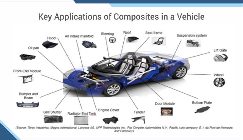Composites now find usage in all the major application areas in an automobile including the interior, exterior, and under the hood applications.