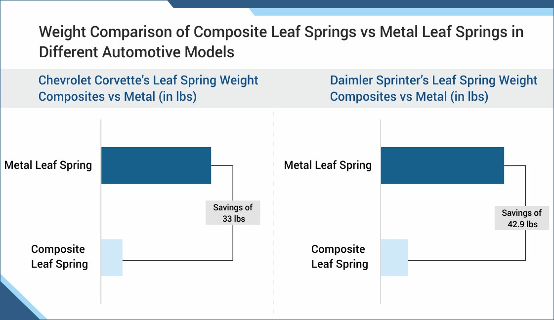 Chevrolet Corvette, Daimler Sprinter, Volvo XC90, Volkswagen Crafter, Fiat Ducato, Range Rover, and Iveco Daily are some of the major light vehicle models using composite leaf springs either on front or rear or both areas.