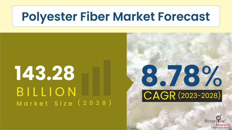 The polyester fiber market was estimated at USD 89.54 billion in 2022 and is likely to grow at a CAGR of 8.78% during 2023-2028 to reach USD 143.28 billion in 2028.