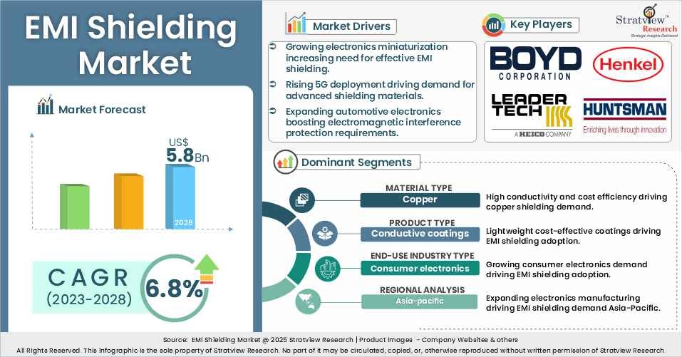 The EMI Shielding Market is anticipated to grow at a promising CAGR of 6.8% during the forecast period to reach US$ 5.8 Billion by 2028.