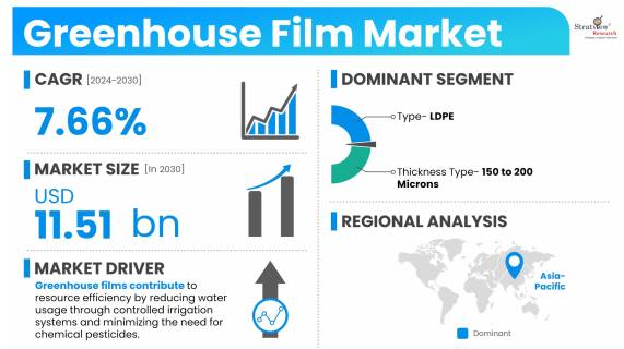 "The greenhouse film market was estimated at USD 6.85 billion in 2023 and is likely to grow at a CAGR of 7.66% during 2024-2030 to reach USD 11.51 billion in 2030."