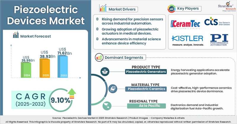 - During the next 8 years (forecast period of 2025-2032), the piezoelectric devices market is expected to grow at a CAGR of 9.10%. The annual demand will reach of USD 71.62 billion in 2032, which is almost 1.84 times (~84% up) of the demand in 2025.