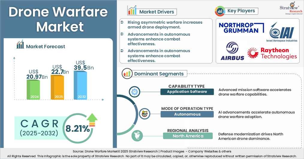 - During the next 8 years (forecast period of 2025-2032), the drone warfare market is expected to grow at a CAGR of 8.21%. The annual demand will reach of USD 39.5 billion in 2032, which is almost 1.74 times (~74% up) of the demand in 2025.