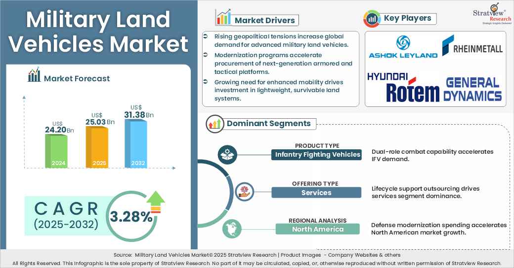 - During the next 8 years (forecast period of 2025-2032), the military land vehicles market is expected to grow at a CAGR of 3.28%. The annual demand will reach of USD 31.38 billion in 2032, which is almost 1.25 times (~25.25% up) of the demand in 2025.