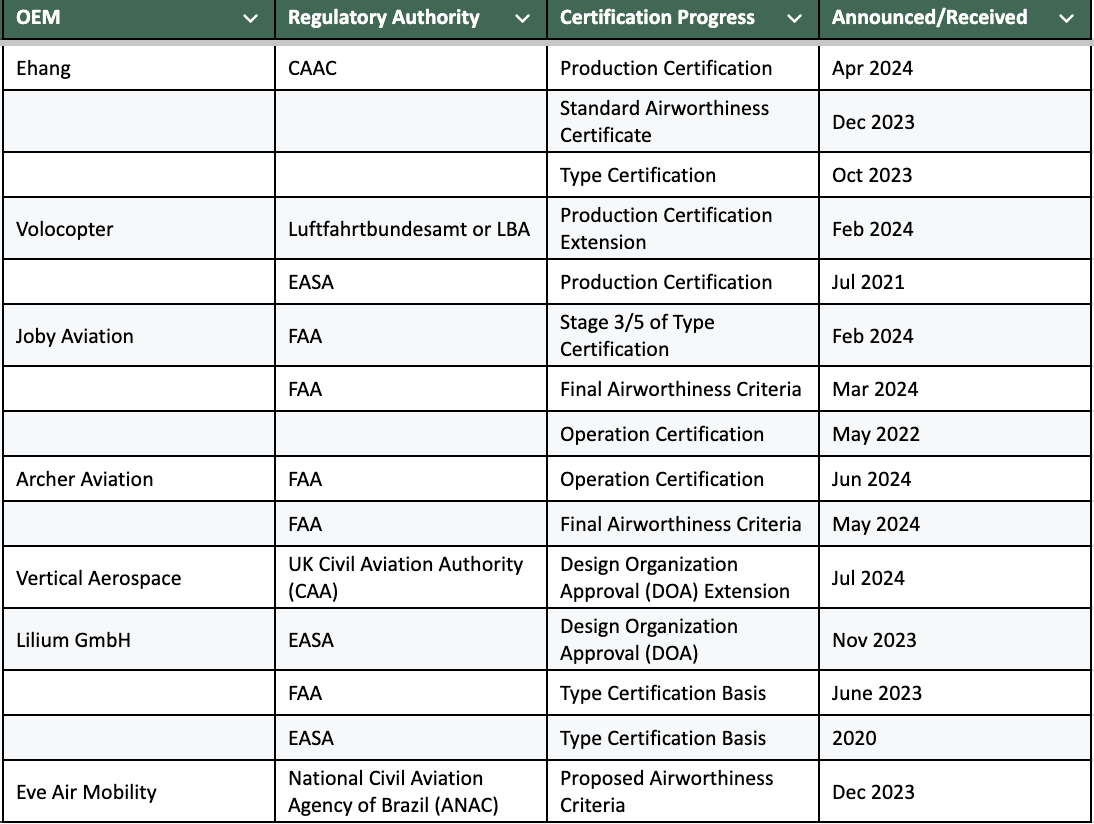 Table 1: Certification Progress for Some Popular Evtol Oems