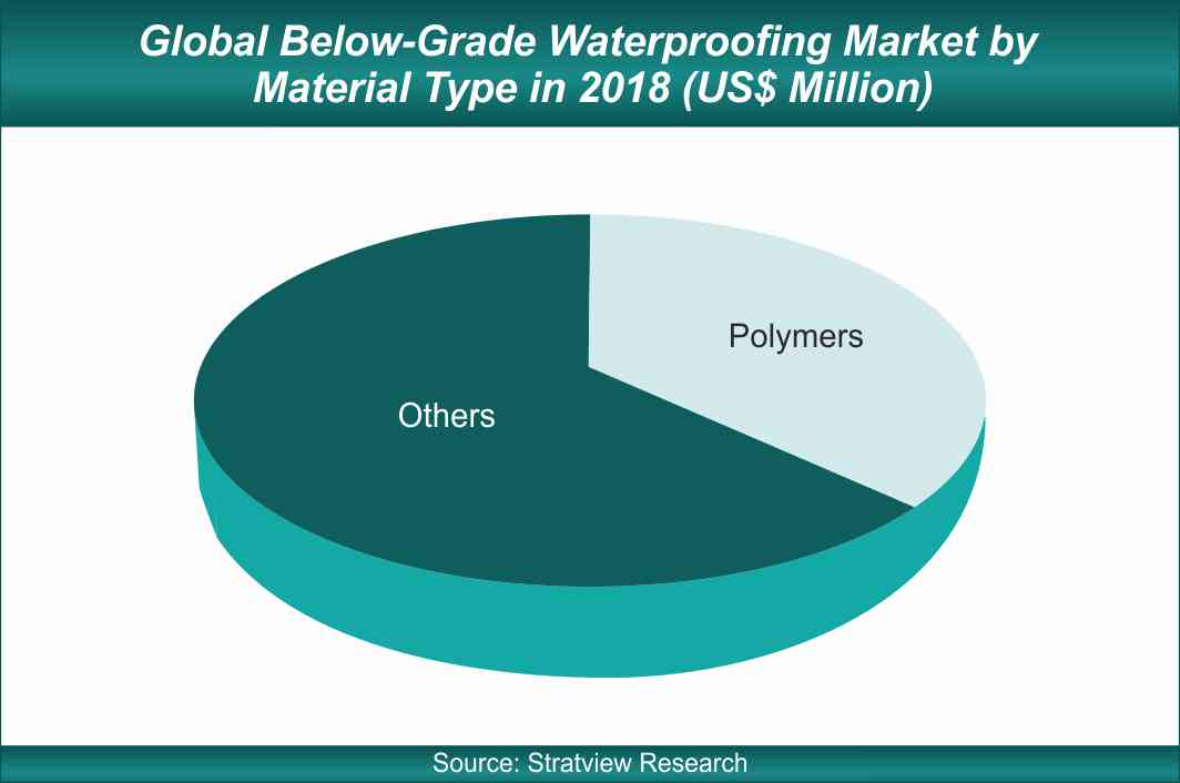 Currently polymers account for 1/3rd of the global market followed by Bitumen. Polymers are lightweight, flexible and highly efficient and reliable and have emerged as the fastest-growing material choice. Bitumen is also a material of choice due to its ability to withstand extreme heat conditions and availability in a variety of thicknesses, along with lower cost as compared to polymers. Bentonite, rubberised asphalt, elastomers, cementitious coatings, and crystalline waterproofing are some other materials used. Bentonite is the third largest and the highest-growing material due to its ability to contract and expand infinite number of times.