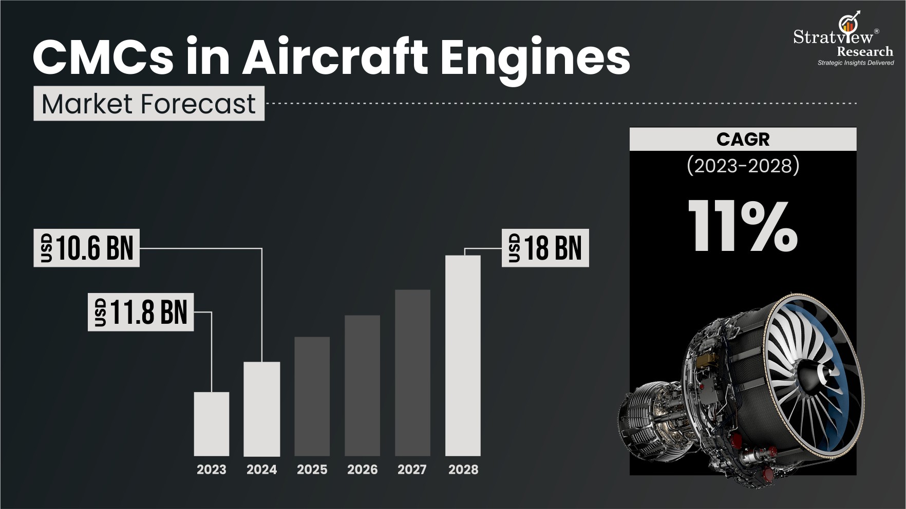 The market size of CMCs in aircraft engines was USD 10.6 billion in 2023 and is expected to climb to USD 11.8 billion by 2024. The market is expected to hit USD 18 billion by 2028, driven by a CAGR of around 11% (according to Stratview Research) .