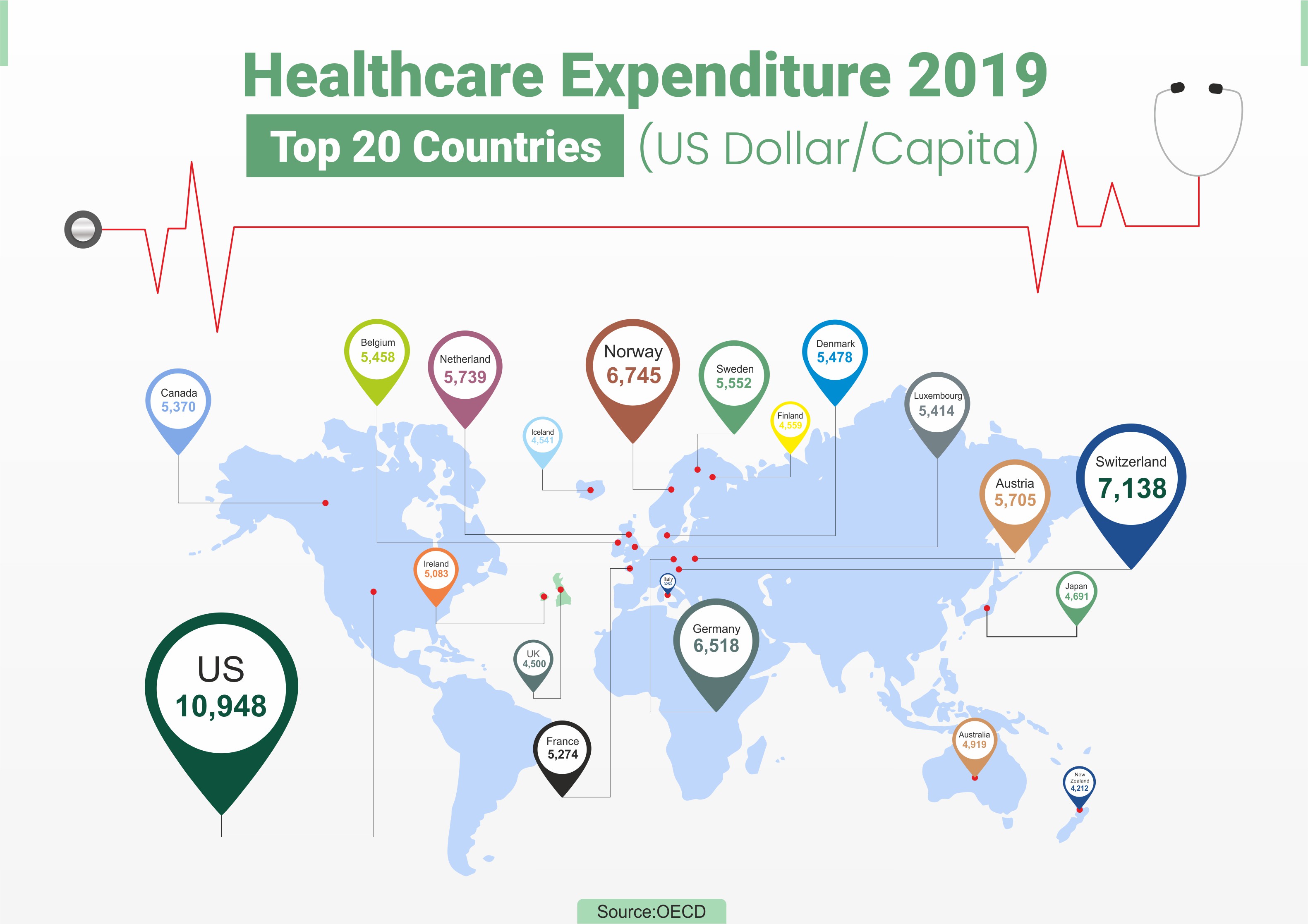 The graph below shows the per-capita healthcare spending of top 20 countries.