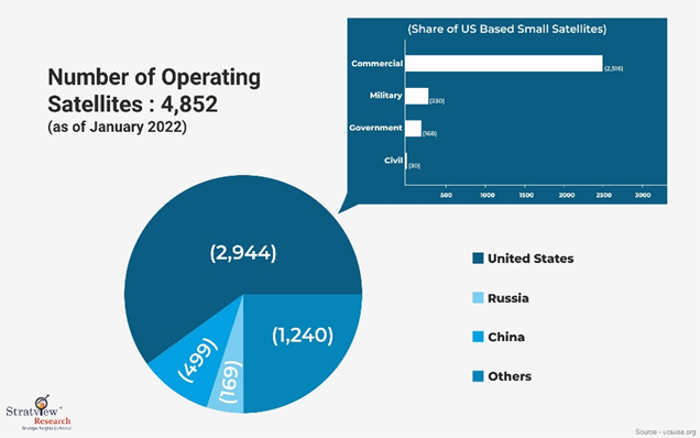 As of January 1, 2022, of the 4,852 active artificial satellites orbiting the Earth, 2,944 belong to the United States. This is by far the largest number for any single country, with their nearest competitor, China, accounting for only 499. Pioneering the small satellites market, in the year 2020, new small satellite launches in the USA grew six-fold from that of the 2019-level, mainly driven by SpaceX’s Starlink constellation.