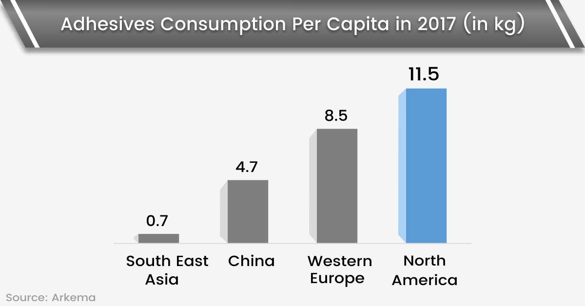 There has been a growth in per capita consumption of adhesives in general. North America tops per capita consumption, while Asia-Pacific leads in overall consumption.