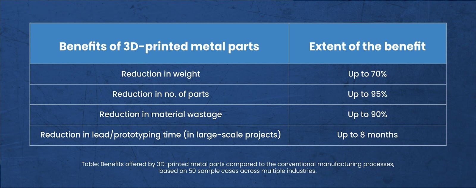 NASA wanted to test a fuel injector for its Space Launch System powering the Orion spacecraft in 2013. Amazingly, NASA got it ‘printed’ by Aerojet Rocketdyne instead of the traditional manufacturing process, and the results left everyone impressed. 3D printing the injector not only reduced the production time from 1 year to just 4 months and the number of parts from 160 to 2 but also reduced the total production cost by 70%. This was only a brief demonstration of the scope of benefits offered by 3D printing. Manufacturing metal parts using 3D printing has a lot to offer.