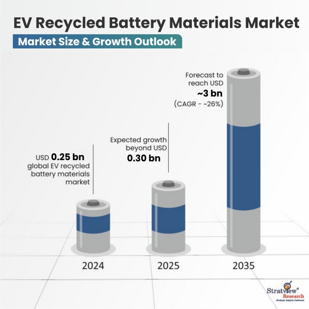 In 2024, the EV recycled battery materials market stood at approximately USD 0.25 billion. It is projected to exceed USD 3.00+ billion by 2035, expanding at a CAGR of roughly 25–26%. This trajectory reflects the emergence of a secondary raw material channel that is gradually integrating into EV supply planning.
